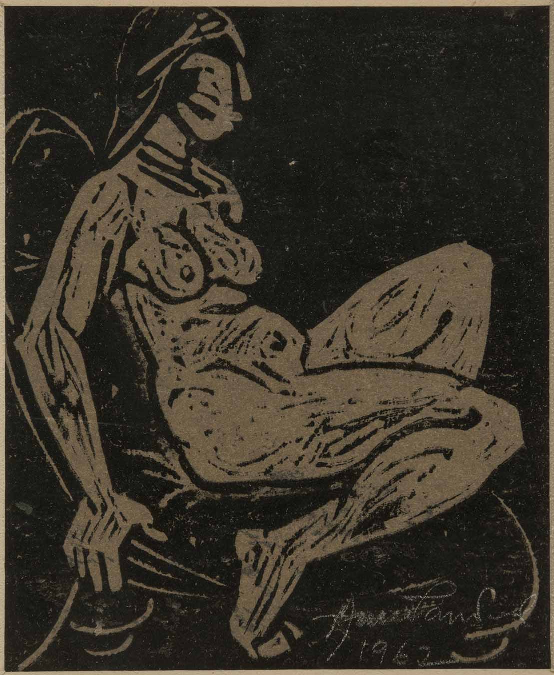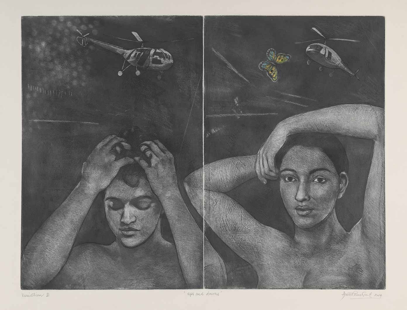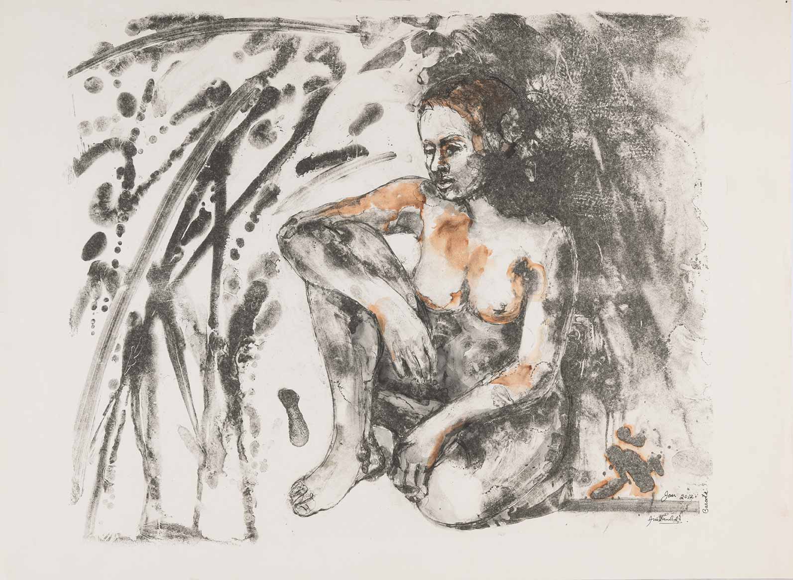 Anupam Sud was born in 1944 at Hoshiarpur, Punjab but spent a substantial part of her childhood in Shimla, Himachal Pradesh. By 1960, her family had migrated to Delhi where she pursued a Diploma in Painting from the College of Art (1962-67). She was the youngest member of Group 8, a printmakers’ collective started by Jagmohan Chopra (1935-2013). Between 1971 and 73, Sud joined the Slade School of Art, London, under the tutelage of Portuguese artist Bartholomew dos Santos to further her study in printmaking. For nearly three decades after her return from London, she taught at the Printmaking department of College of Art, New Delhi. Sud’s practice largely focuses on various intaglio processes and printmaking techniques composing themes focused on the human figure. Over time, her practice has evolved to include other mediums such as painting, charcoal, pastels and ink.