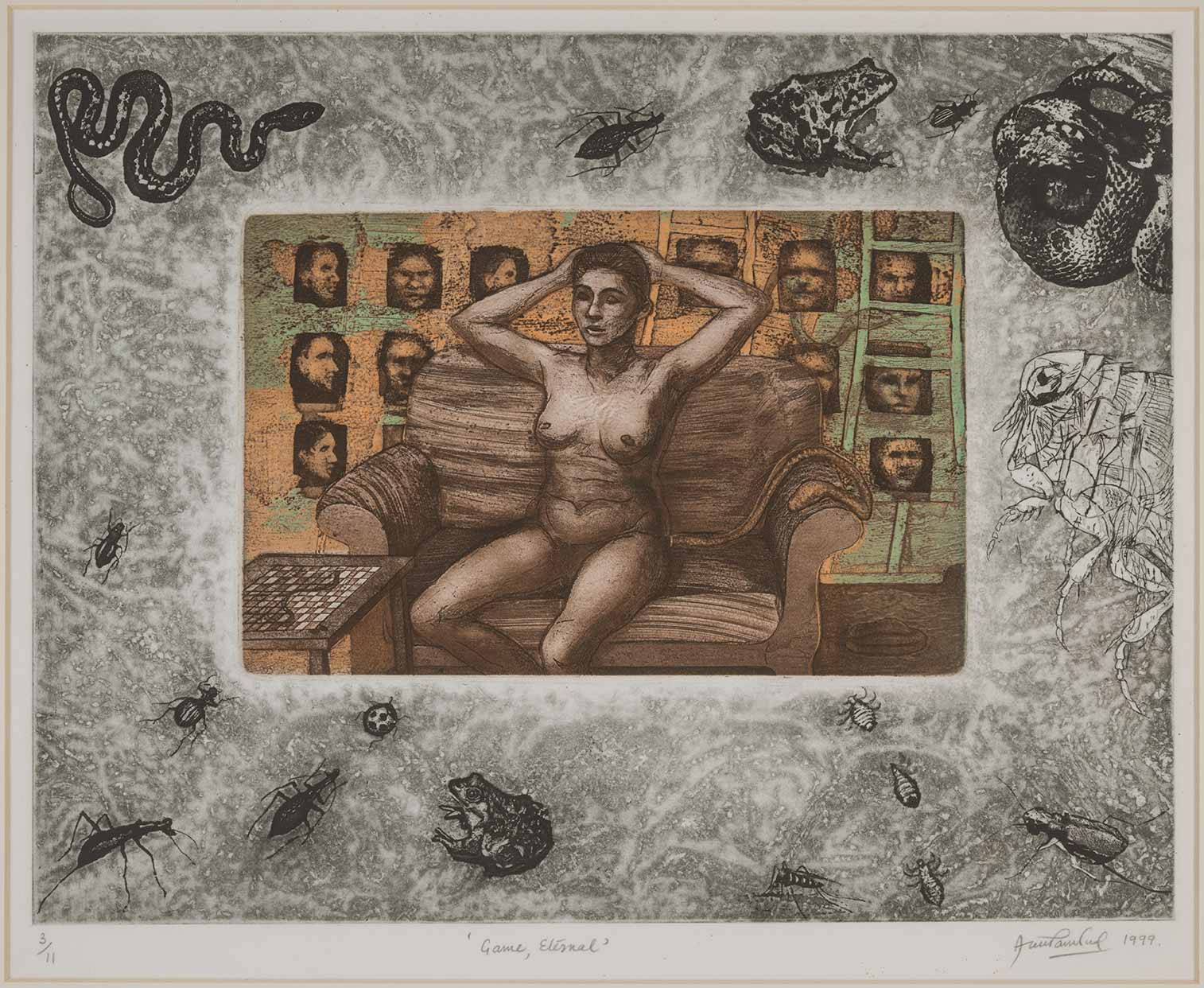 Working daily for over five decades now, Anupam Sud’s artistic oeuvre defies any easy classification due to the sheer volume and diversity of her practice. She is perhaps one of the most distinguished Indian artists, especially with her contribution to printmaking and her sustained enquiry into the human form and its existential predicaments. A committed artist, she has also been a compassionate teacher, an inspiration to generations of students. Anupam was encouraged by the attention given to her work by Somnath Hore (who was brought into Delhi to set up a printmaking department at the College of Art) and later, by her teacher Jagmohan Chopra (founder of Group 8, the first collective of Indian printmakers). Silently and slowly subverting the archaic notions of male supremacy and puritan idioms of modernism, she evolved a pictorial language stamped with her idiosyncratic vision, marking her vantage point, soon after returning from the Slade School of Fine Art, London, in 1973.